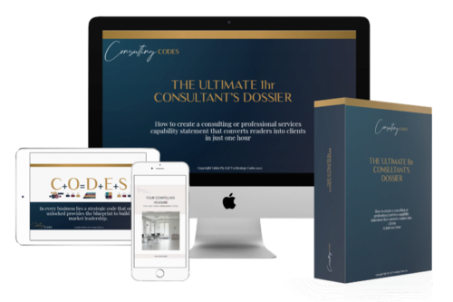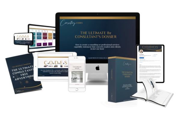 I'm so glad you asked. There's a unique strategic code that unlocks your pathway for market leadership and the vast number of businesses are completely unaware of it. It literally lays out the prefect way to talk to your market, provide the right services and sets you apart from a vast sea of competitors. The Ultimate 1hr Consultant's Dossier leverages that strategy to uncover what you should include, what to say and start getting people talking about you. You'll be amazed at what is just around the corner when you see your Strategy CODES.
